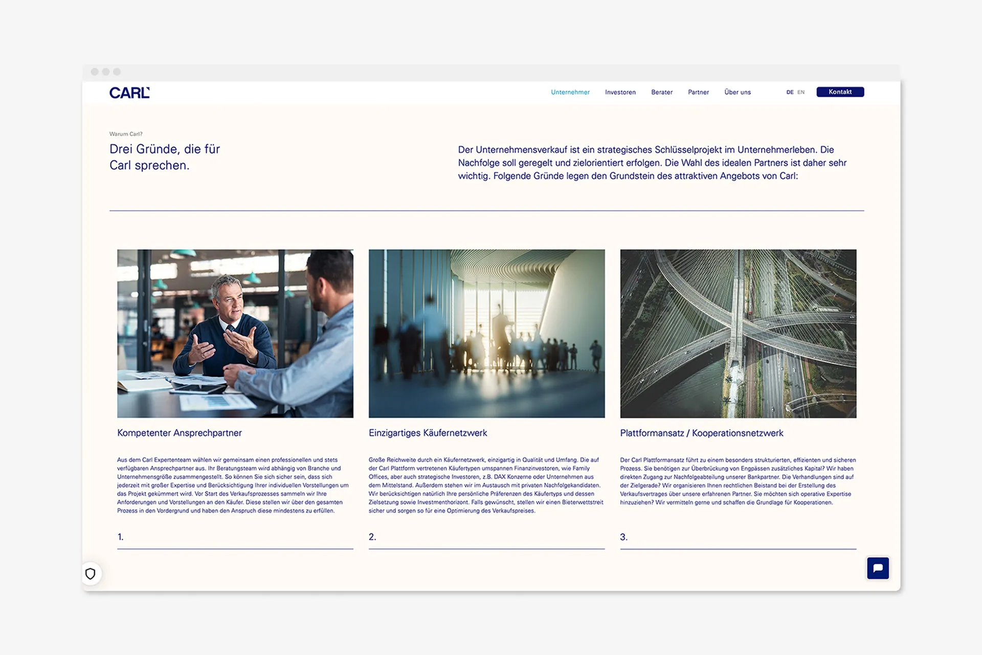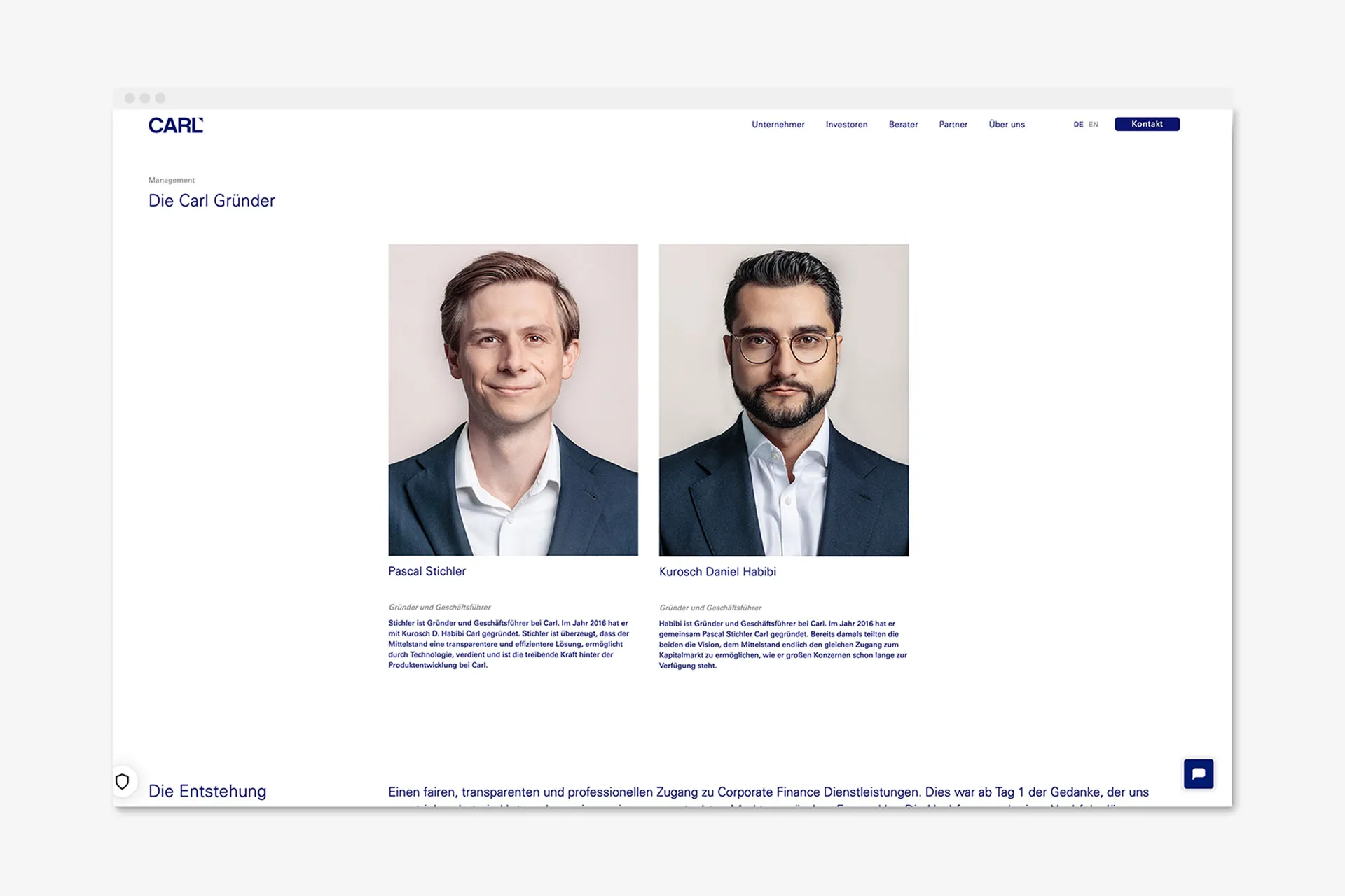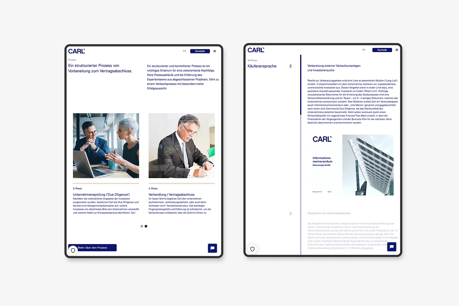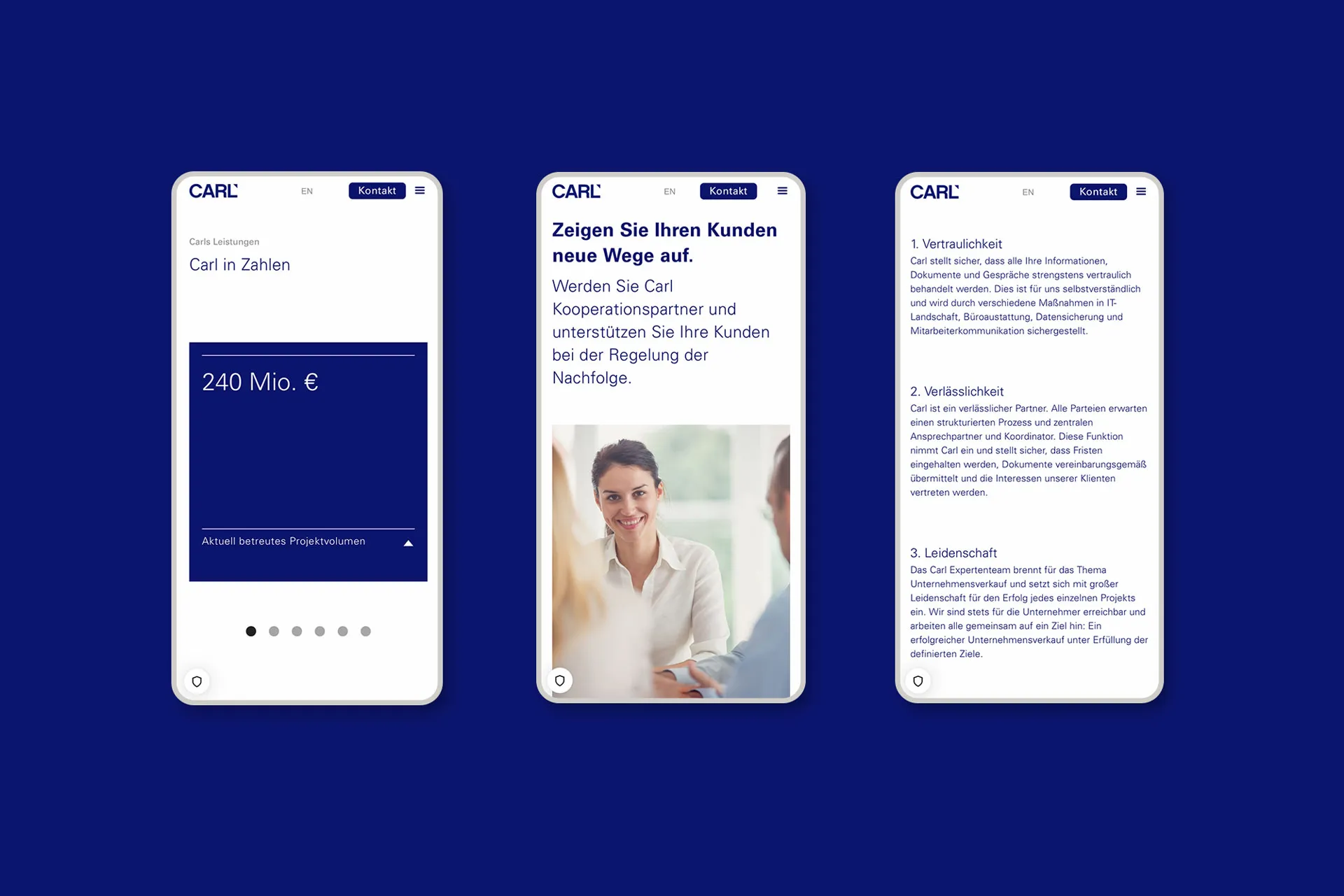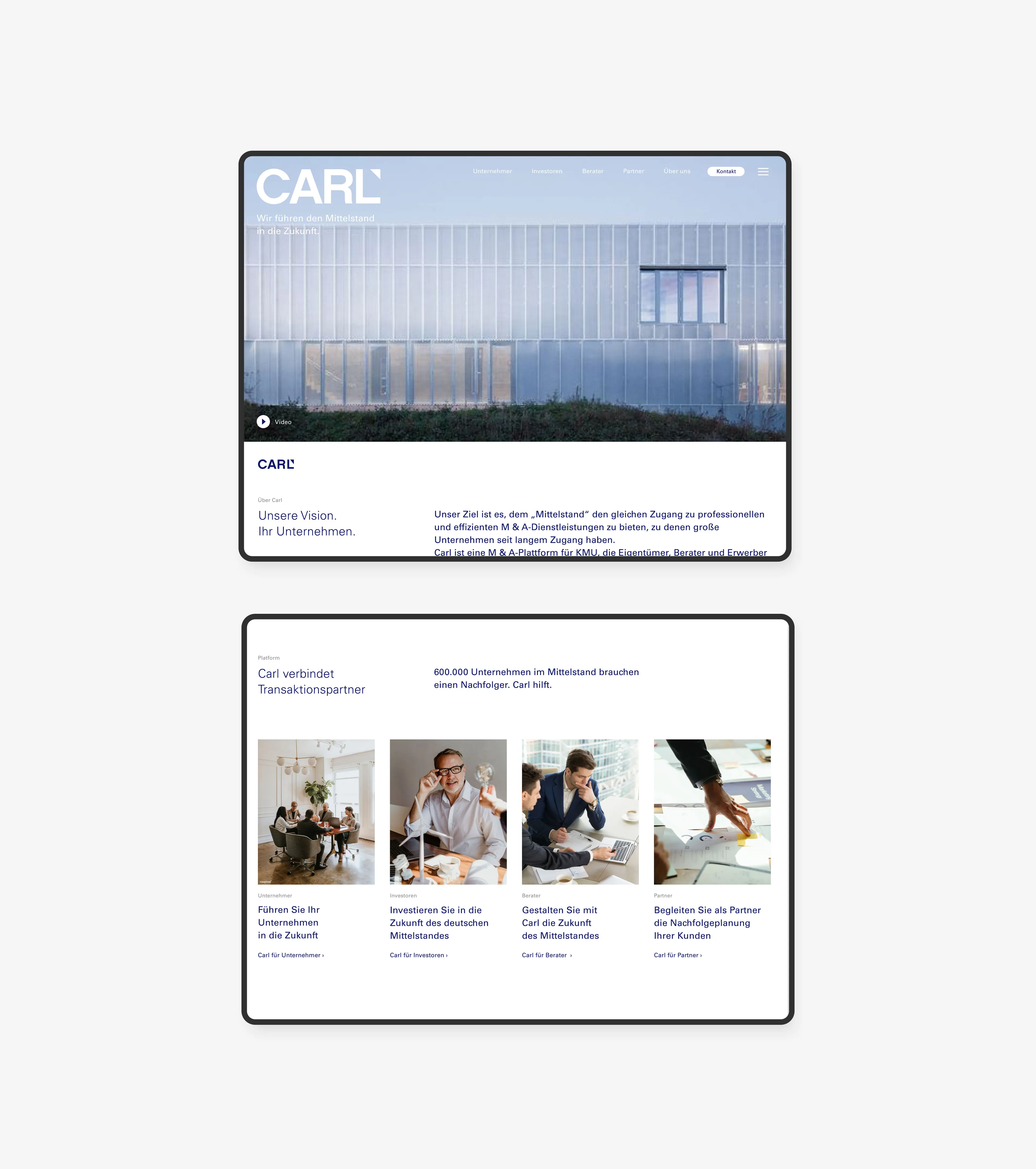 Das Unternehmen Carl hat sich seit seiner Gründung in 2016 zu Europas führender M&A-Plattform für Unternehmensverkäufe entwickelt. Das alte Corporate Design passte nicht mehr zum Image der nun erwachsen gewordenen Marke, für die im Rahmen des Redesigns ein solider und professioneller Look entwickelten wurde. Ziel war es, Unternehmenswerte wie Agilität, Integrität und Herzblut im Corporate Design zu transportieren und eine zugängliche, vertrauensvolle Marke zu schaffen.