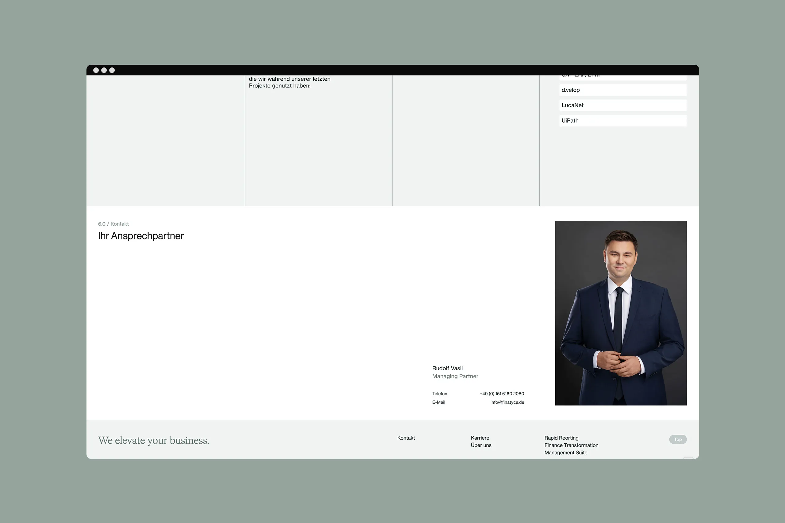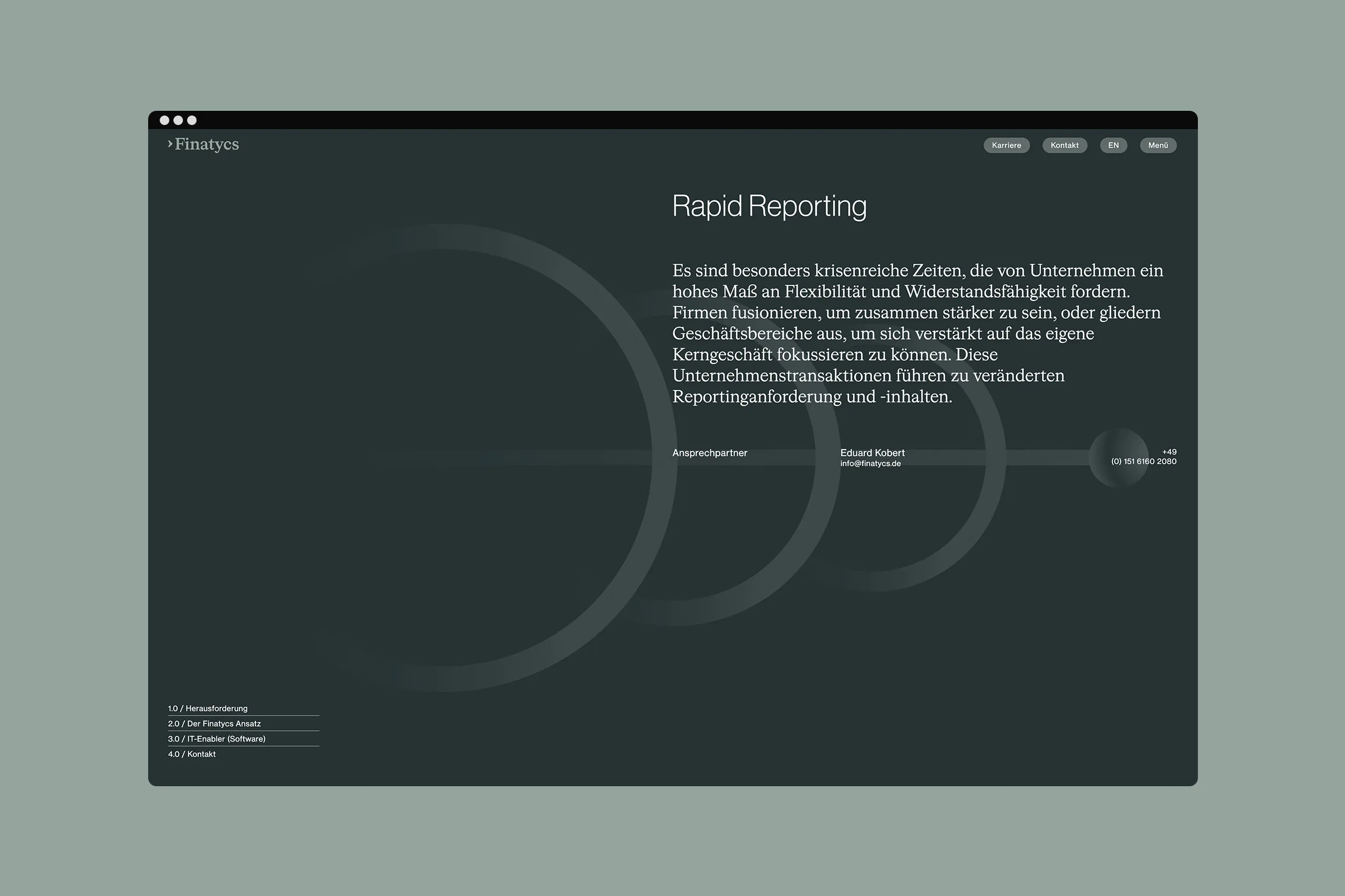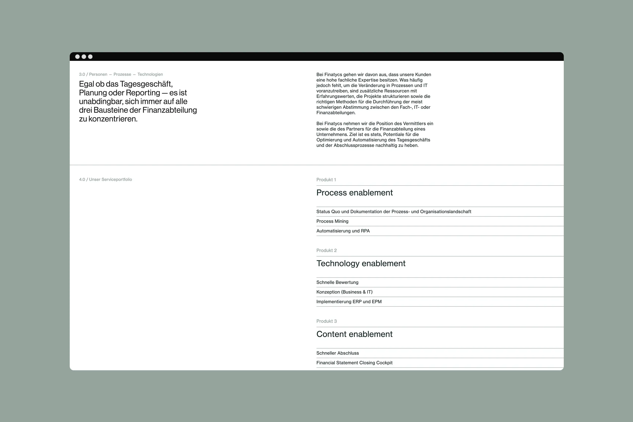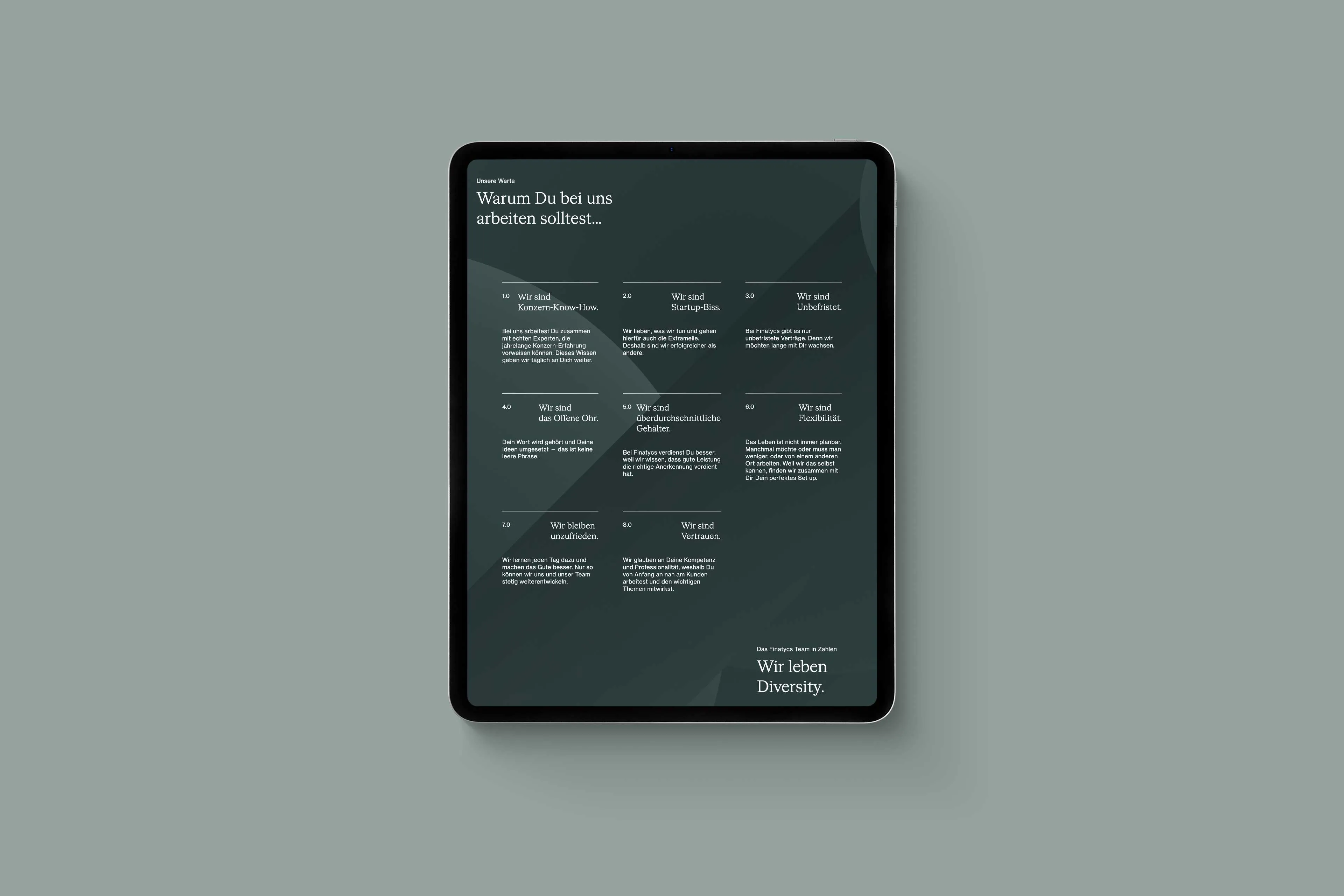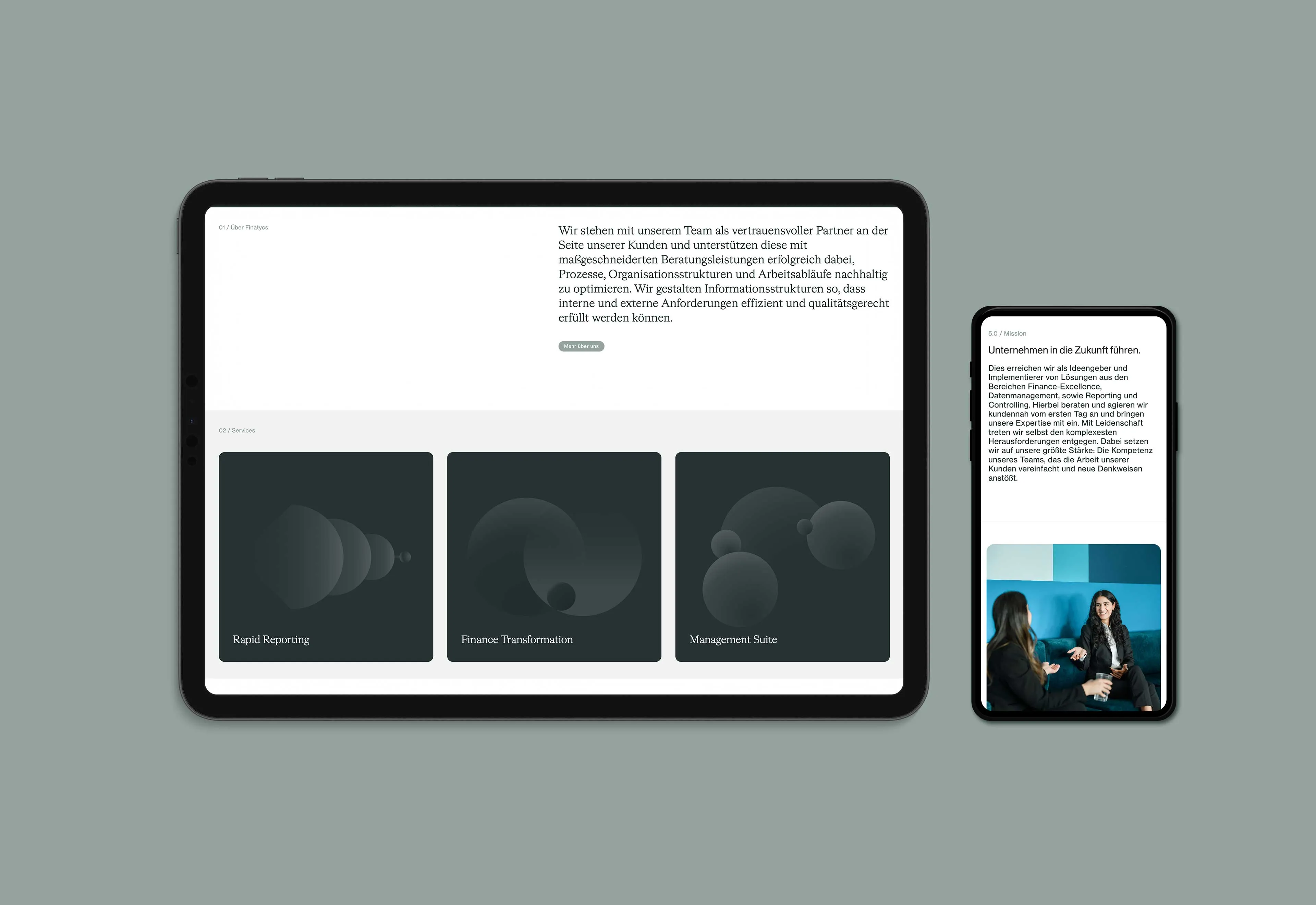 Im Rahmen von maßgeschneiderten Beratungsleistungen optimiert das Team von Finatycs Prozesse, Organisationsstrukturen und Arbeitsabläufe mit nachhaltigem Erfolg.Wir durften die Unternehmensberartung aus Berlin bei ihrem Rebranding begleiten. Ausgangspunkt war eine Markenstrategie, in der wir die Positionierung des Unternehmens am Markt definierten, sowie die Kernaspekte der Markenidentität herausarbeiteten. Integrität, Teamgeist und Expertise waren die Leitideen des Corporate Designs. Klare Farben und eine charakterstarke Schriftauswahl schaffen Vertrauen. Die moderne Bildmarke, welche auch als Leitsymbol zum Einsatz kommt, symbolisiert den steten Blick in die Zukunft.