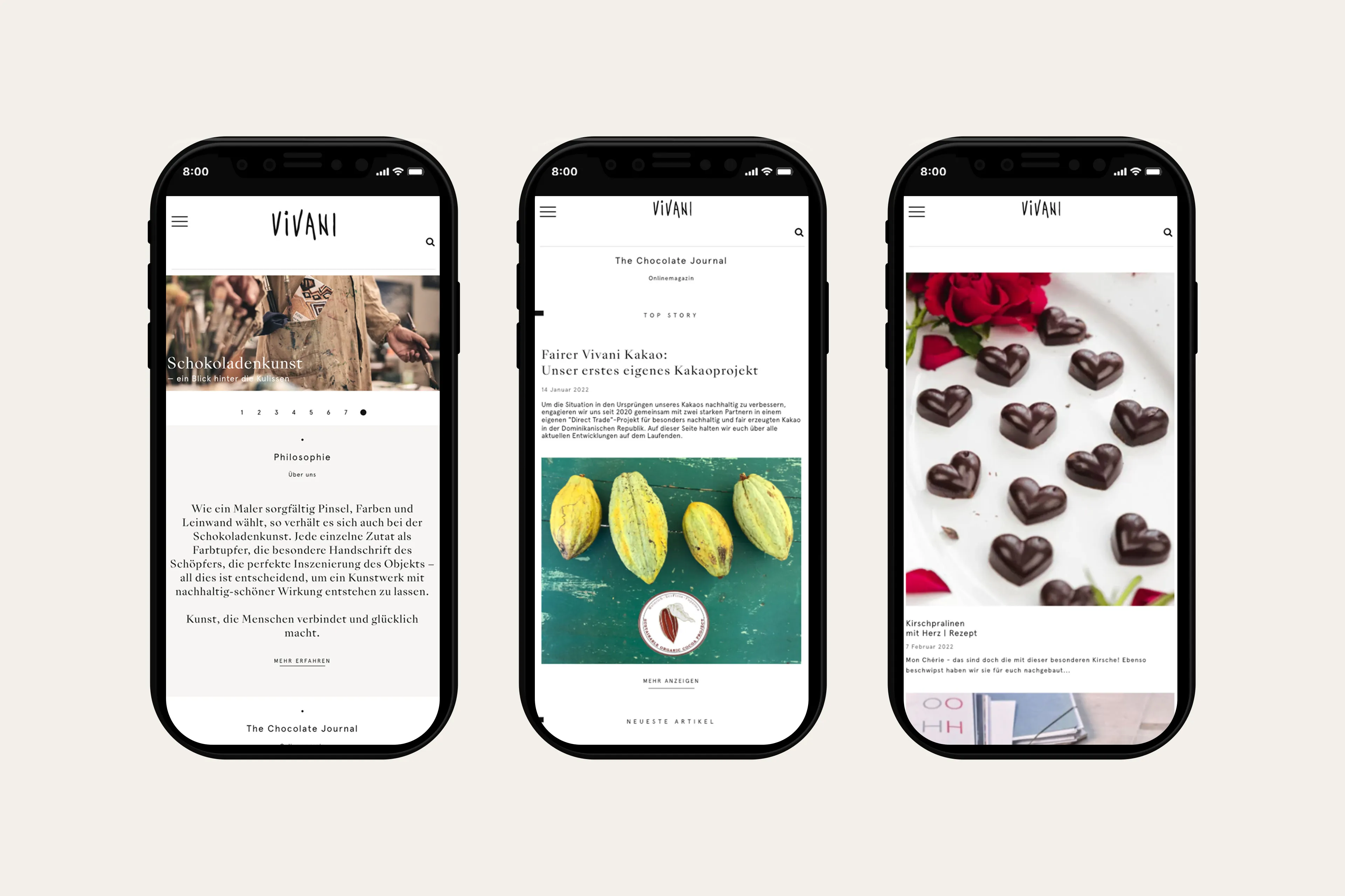 Wir begleiteten das Unternehmen EcoFinia beim Redesign und der konzeptionellen Markenneuausrichtung seiner Schokoladenmarke VIVANI. Strategisches Marketingkonzept — Packaging — Webdesign — Marketingmedien — das gesamte Erscheinungsbild wurden von uns zusammen mit dem Team entwickelt und der Marke somit ein moderneres, jüngeres Erscheinungsbild verliehen. Neben dem ökologischen und rundum nachhaltigen Aspekt, den die Schokolade ausmacht, wurde dabei auch die DNA der Marke berücksichtigt.