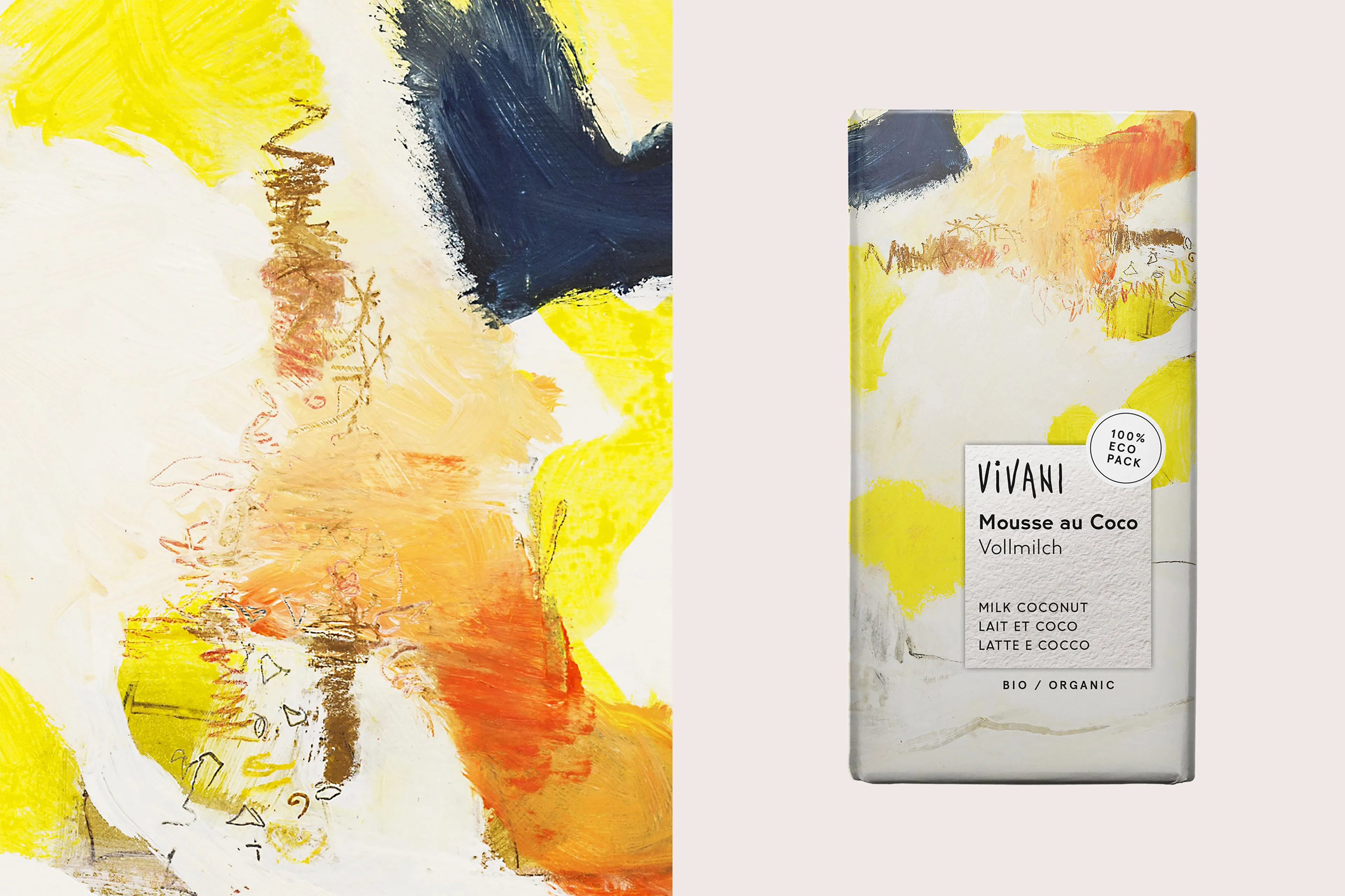 Der Slogan THE ART OF CHOCOLATE war unser Ausgangspunkt bei der strategischen Markenneuausrichtung. Unser Ziel war es, das Thema Kunst, das VIVANI bereits von Anfang an beschreibt, als kreative Leitidee der Marke zu stärken und sowohl visuell als auch im Wording hervorzuheben. Die Artworks entstanden in Kooperation mit der Künstlerin Annette Wessel und sind seit Gründung der Marke das Augenmerk des Verpackungsdesigns. Durch eine neue, herangezoomte Betrachtungsweise von Wessels Kunst wurde ein frischerer, zeitgenössischer Look der Verpackungen angestrebt.